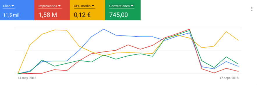 Se ha invertido en publicidad online, Google Adwords y Facebook Ads en diversas modalidades: anuncios, display, remarketing, etc. No se ha realizado un gasto fijo, sino que se han ido generando anuncios y evaluando de forma continua su eficiencia, de modo que se ha invertido más dinero en aquellos que resultaban más eficientes, hasta alcanzar un coste medio por click (CPC) muy bajo: 0,12€.