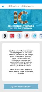 Tipos de Itinerarios: una vez se accede a la aplicación móvil el usuario podrá seleccionar una de las 4 tipologías de itinerarios existentes. A su vez, cada una de éstas dará acceso a diversos itinerarios, de manera que pueda seleccionar el que le interese conocer o visitar.