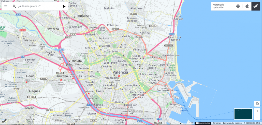En este caso decidimos utilizar, por primera vez, los mapas de Here, enfocados “en el concepto de ubicación y el potencial que tiene para mejorar radicalmente la forma en que hacemos negocios, la forma en que nos movemos y la forma en que vivimos”. Here es una empresa de gran solvencia que está especializada en proveer de cartografía automóviles y que está trabajando en el desarrollo de los futuros coches autónomos.