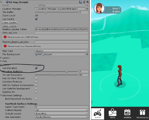 - Elevación del terreno: Una de las características que hemos utilizado en la aplicación de Alto Turia es la elevación del terreno. Estas adaptan el mapa plano para representar cambios de elevación que pueden personalizarse para mejorar el aspecto visual y mejorar el rendimiento, modificando la resolución de estos tiles o añadiendo un multiplicador de elevación. Esta opción de personalización parece que solo tiene sentido en zonas rurales u otras zonas donde los cambios de altura en el terreno sean bruscos o muy característicos. Un problema que hemos encontrado al utilizarlo es que la información de los tiles no se obtiene de la misma manera cuando se activa esta opción, y se ha dado el caso de que algunos tiles no tienen información de altura. Por lo tanto, se “pintan a altura 0″ por lo que encontramos cuadrados en el mapa que parecen fosos. Si después de analizar el entorno donde tiene lugar la experiencia, decidimos activar esta funcionalidad tendremos que marcar la opción «Use elevation» en el objeto con el script «GO Map» de la escena y adaptar los scripts de posicionamiento para que usen altura.